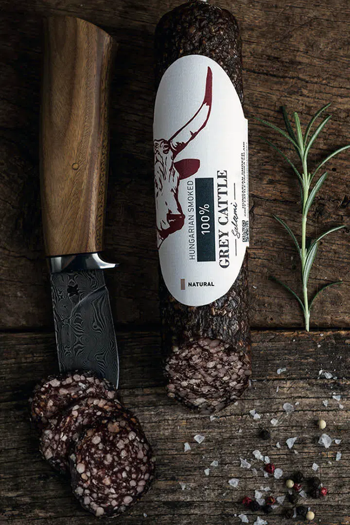 A 100%-os termékeink mesterséges adalékanyagoktól mentesek, kiemelkedően magas hústartalmukkal is a legmagasabb minőséget garantáljuk. Az ásványi anyagokban gazdag, gyógynövényes jegyeket hordozó, vadéhoz közel álló szürkemarhahús karaktere eltéveszthetetlen. A változatos borsfélék teszik teljessé az egyedülálló gasztronómiai élményt. A szalámi hagyományos bükkfa füstöléssel és szárításos érleléssel készül.